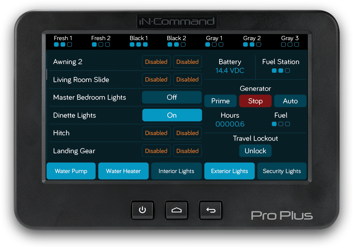 iN·Command Pro Plus keeps you in complete control of even the most sophisticated RV with control of up to nine motorized functions, water and fuel tank monitoring, and a wide array of light and panel functions, you’re able to take command of your camping experience. Control your RV form the inside with the 7-inch touchscreen Display Commander (DC) or remotely from anywhere within Bluetooth range with the iN·Command Pro Series app.